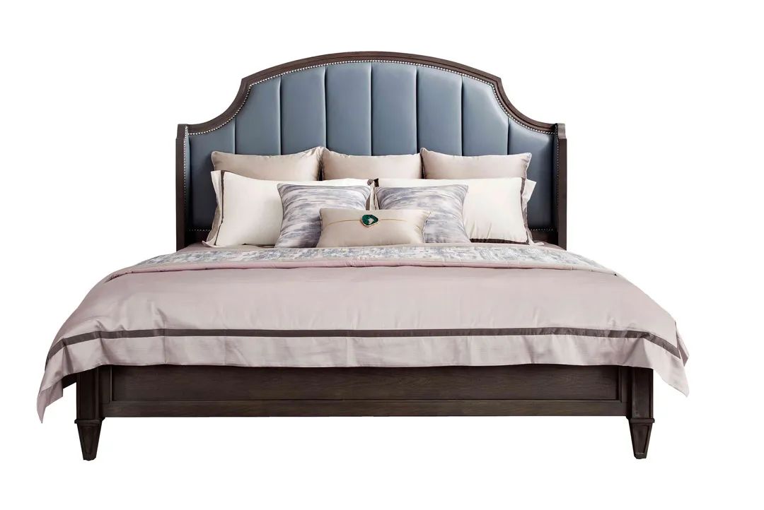 淡蓝色也是冷静色,可以使人更加容易入睡。床屏的边缘采用了铆钉镶嵌,在光线照射下可提亮空间,使床屏看起来更加精致,更有轻奢的高级感。